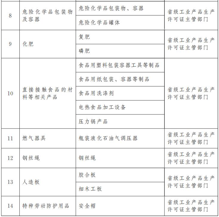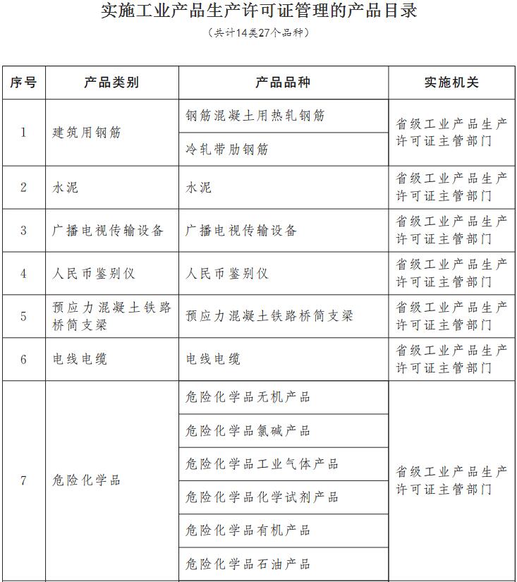 《決定》提出,對冷軋帶肋鋼筋、瓶裝液化石油氣調壓器、鋼絲繩、膠合板、細木工板、安全帽等6種產品實施工業產品生產許可證管理。調整后,實施工業產品生產許可證管理的產品共計14類27個品種。