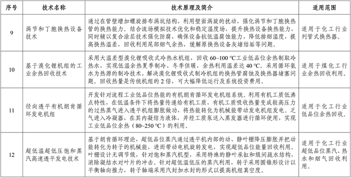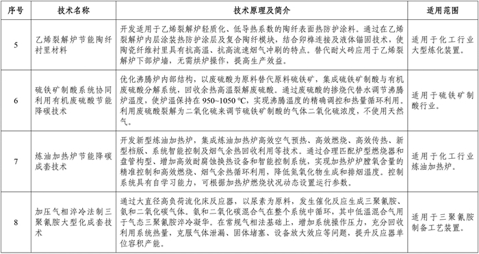 石化化工行業節能降碳技術共有12項,分別是高效尿素合成工藝技術、橡膠串聯密煉技術、全重力平衡油氣水處理一體化技術、五塔四效甲醇精餾技術、乙烯裂解爐節能陶纖襯里材料、硫鐵礦制酸系統協同利用有機廢硫酸節能降碳技術、煉油加熱爐節能降碳成套技術、加壓氣相淬冷法制三聚氰胺大型化成套技術、渦節和丁胞換熱設備技術、基于溴化鋰機組的工業余熱回收技術、徑向透平有機朗肯循環發電機組、超低溫超低壓飽和蒸汽高速透平發電技術。