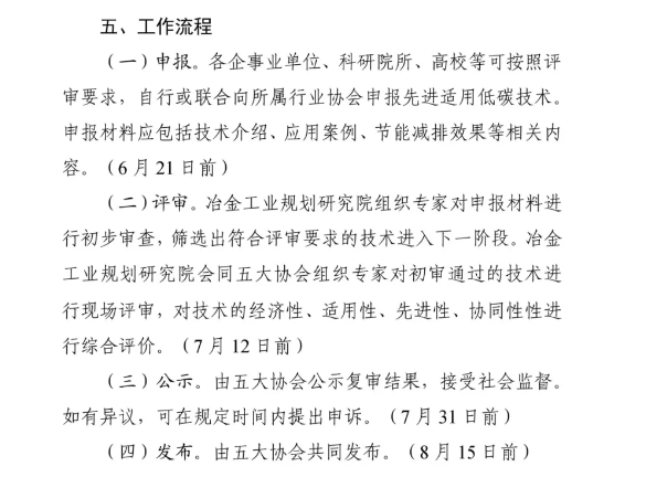 本次遴選工作由工業和信息化部原材料工業司統籌指導,冶金工業規劃研究院負責業務支撐,由中國石油和化工工業聯合會、中國鋼鐵工業協會、中國有色金屬工業協會、中國建筑材料聯合會、中國稀土行業協會(以下簡稱五大協會)組織推薦,經專家評審,遴選出 20 個先進適用低碳技術,并由五大協會共同發布。